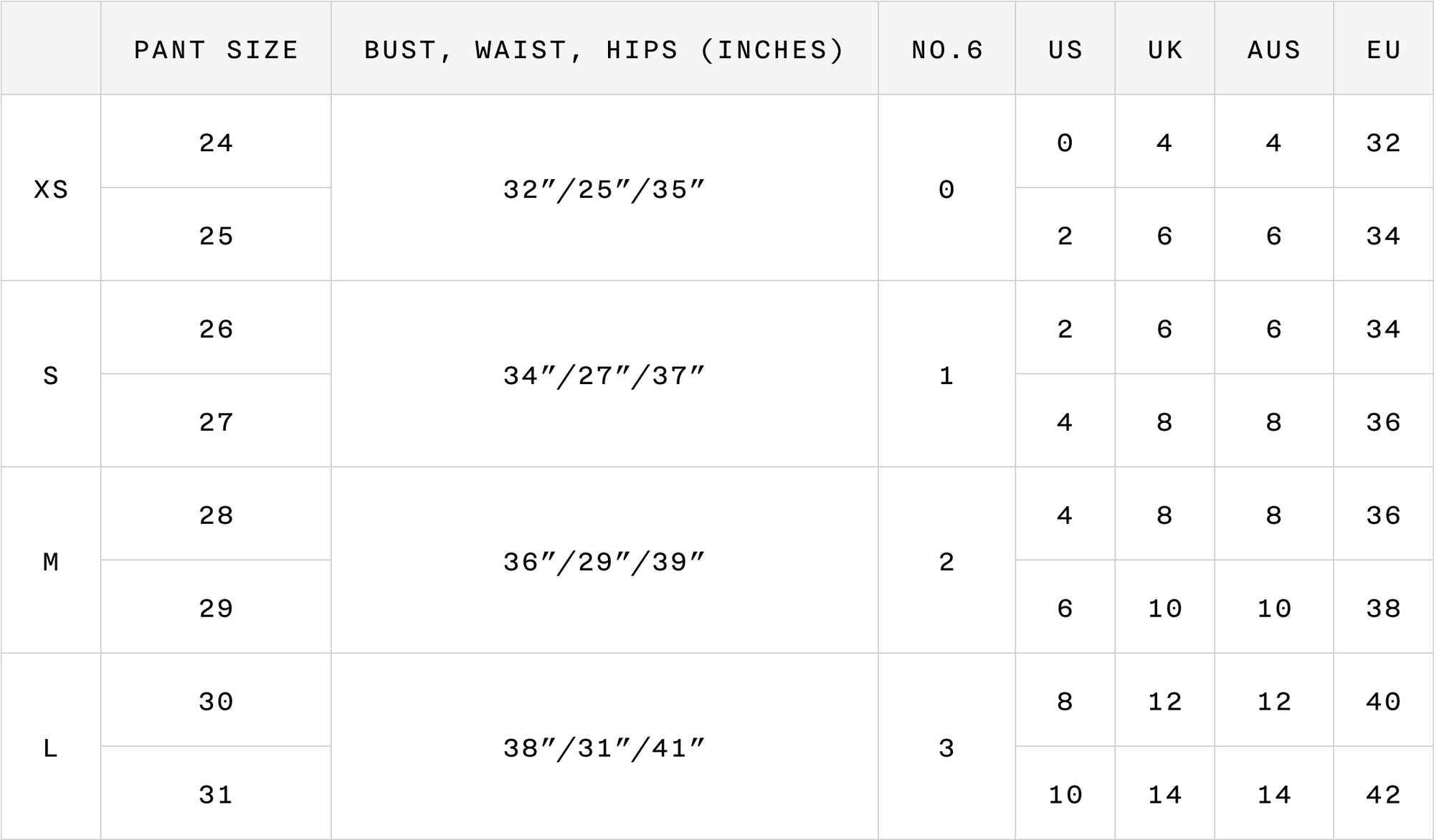 - Rise – find a pair of pants that fit you well and measure from the top of the waistband to the crotch to compare measurements.